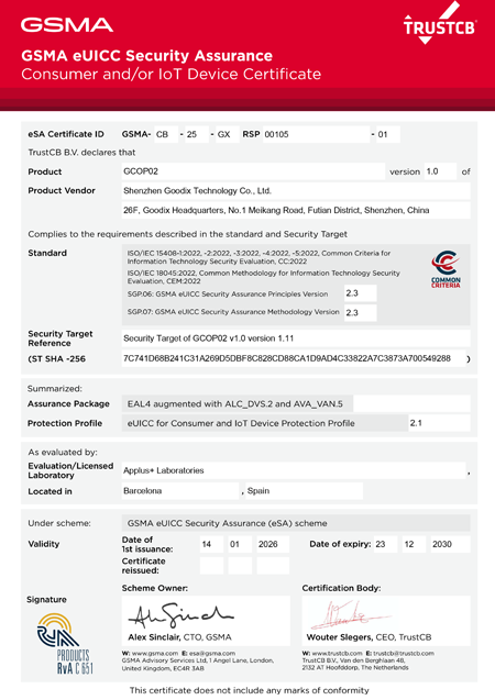Goodix eSIM (embedded SIM) solution integrates a SOGIS CC EAL6+ certified security chip and runs an operating system that has received GSMA eUICC Security Assurance (eSA) and COS SOGIS CC EAL5+ certifications.